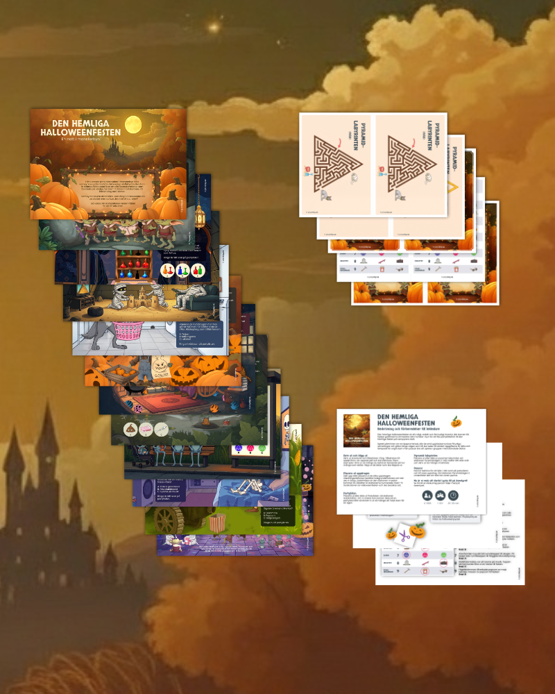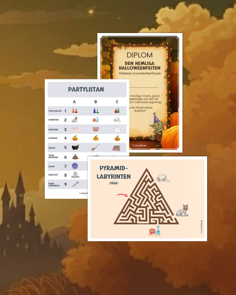Tillbehör: Svarskort, 2 labyrinter, inbjudningskort, diplom.